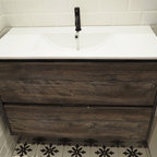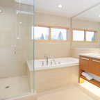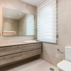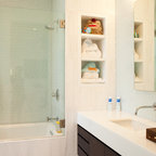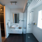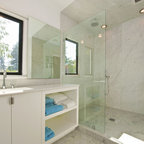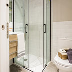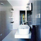 Foto di una piccola stanza da bagno con doccia contemporanea con piastrelle grigie e piastrelle in ceramica — Houzz