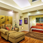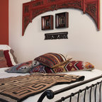 Immagine di una camera matrimoniale etnica con pareti multicolore e parquet scuro — Houzz