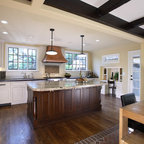 Idee per una cucina lineare classica chiusa e di medie dimensioni con lavello stile country, ante con riquadro incassato, paraspruzzi marrone, parquet scuro, isola, ante bianche, top in quarzo composito, paraspruzzi in lastra di pietra, elettrodomestici da incasso, pavimento marrone e top marrone — Houzz