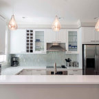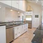 Ispirazione per una grande cucina stile marinaro con lavello sottopiano, ante bianche, top in vetro riciclato, paraspruzzi blu, elettrodomestici neri, parquet scuro e isola — Houzz