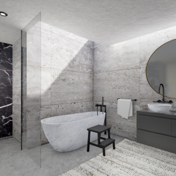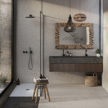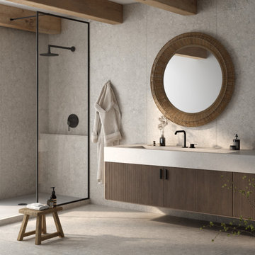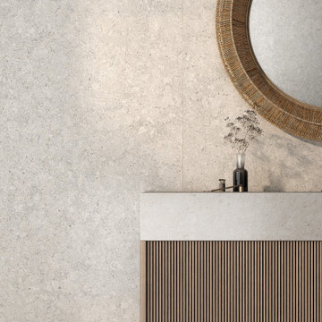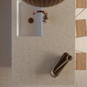 Idee per una piccola stanza da bagno minimal con ante grigie, WC sospeso, piastrelle beige, piastrelle in ceramica, pareti beige, pavimento in gres porcellanato, lavabo integrato, top piastrellato, pavimento beige, top grigio, mobile bagno sospeso e ante lisce