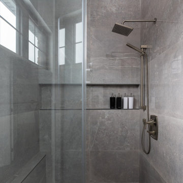 Esempio di una stretta e lunga stanza da bagno con doccia industriale di medie dimensioni con nessun'anta, ante in legno chiaro, doccia alcova, WC a due pezzi, piastrelle bianche, piastrelle in gres porcellanato, pareti grigie, pavimento in gres porcellanato, lavabo a bacinella, top in legno, pavimento grigio, porta doccia scorrevole, un lavabo, mobile bagno freestanding e soffitto ribassato
