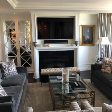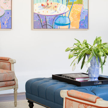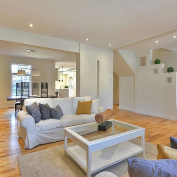 Esempio di un soggiorno chic aperto con pareti bianche, pavimento in legno massello medio e pavimento marrone