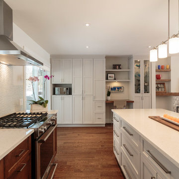 Immagine di un grande cucina con isola centrale tradizionale con lavello stile country, ante con riquadro incassato, ante bianche, top in quarzo composito, paraspruzzi bianco, paraspruzzi con piastrelle in pietra, elettrodomestici in acciaio inossidabile, pavimento in legno massello medio, pavimento marrone e top bianco