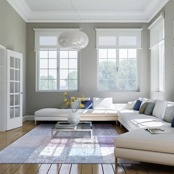 Ispirazione per un grande soggiorno minimal con pareti bianche, parquet chiaro, nessun camino e pavimento marrone