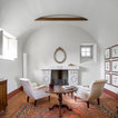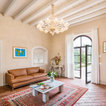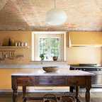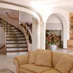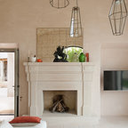 Immagine di un soggiorno mediterraneo chiuso e di medie dimensioni con pareti bianche, camino classico, cornice del camino in pietra, nessuna TV e pavimento in mattoni — Houzz