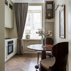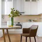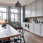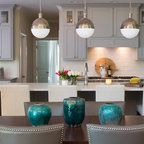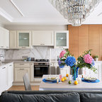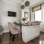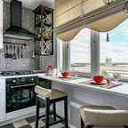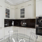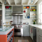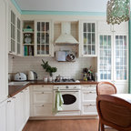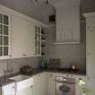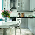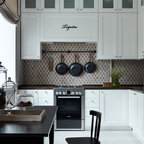 Immagine di una cucina a L tradizionale con lavello stile country, ante con riquadro incassato, ante bianche e paraspruzzi grigio — Houzz