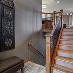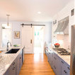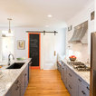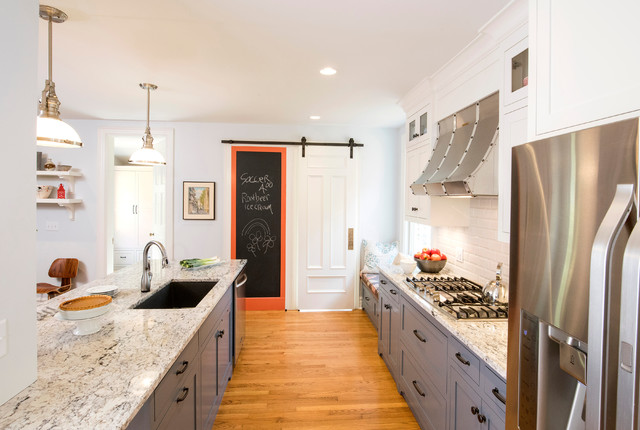 Kitchen with barn door and chalkboard.