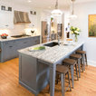 Immagine di una cucina chic di medie dimensioni con lavello sottopiano, ante lisce, ante grigie, top in granito, paraspruzzi bianco, paraspruzzi con piastrelle in ceramica, elettrodomestici in acciaio inossidabile, parquet chiaro e isola — Houzz