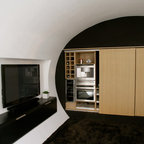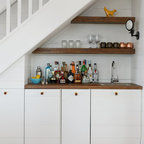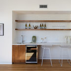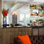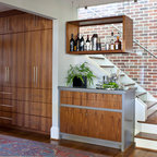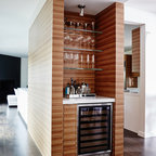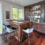 Esempio di un bancone bar design con ante lisce, top in legno, pavimento in legno massello medio e top marrone — Houzz