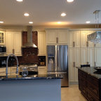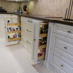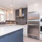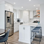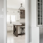 Ispirazione per una cucina tradizionale di medie dimensioni con lavello a doppia vasca, ante in stile shaker, ante bianche, top in superficie solida, elettrodomestici bianchi, pavimento in gres porcellanato e pavimento grigio — Houzz