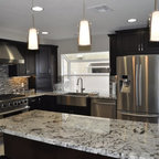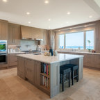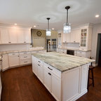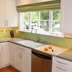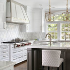 Ispirazione per una cucina classica di medie dimensioni con lavello sottopiano, ante in stile shaker, top in quarzo composito, paraspruzzi bianco, paraspruzzi con piastrelle diamantate, elettrodomestici in acciaio inossidabile, parquet chiaro, pavimento grigio e top bianco — Houzz