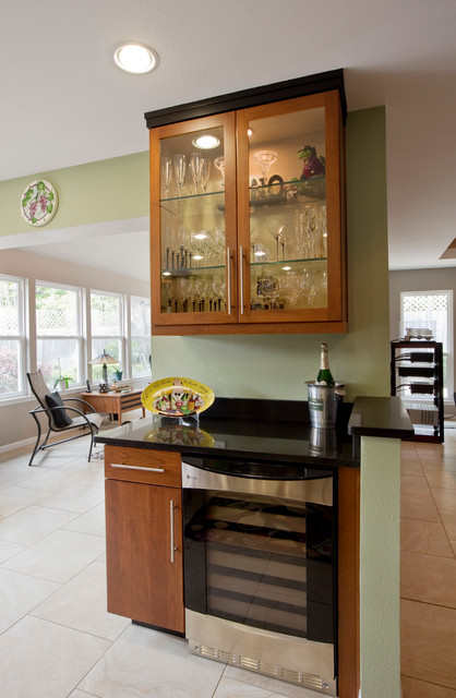 Wet bar with wine cooler and can lights
