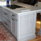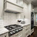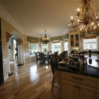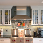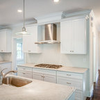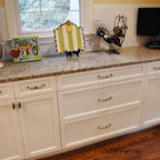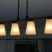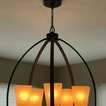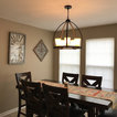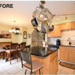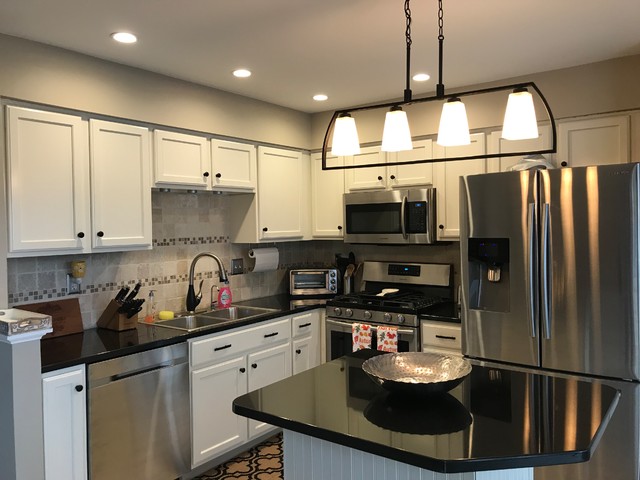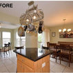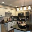 The "after" photo of a kitchen renovation project. A new island chandelier and new recessed LED trims provided more adequate light for the space, and perfectly accented the appliance, cabinet, and hardware upgrades.