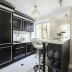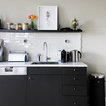 Foto di una piccola cucina nordica con ante lisce, ante nere, paraspruzzi bianco, paraspruzzi con piastrelle diamantate, elettrodomestici da incasso, parquet scuro, lavello da incasso, top in marmo e pavimento marrone — Houzz