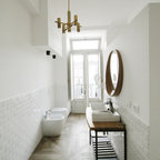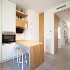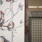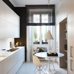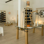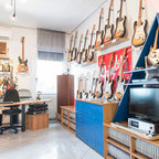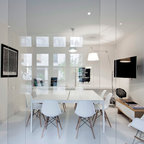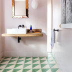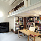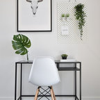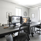 Esempio di un piccolo ufficio industriale con pareti bianche, nessun camino, scrivania autoportante e pavimento multicolore — Houzz