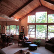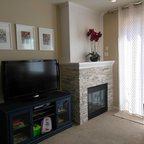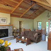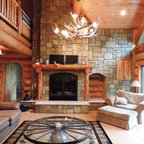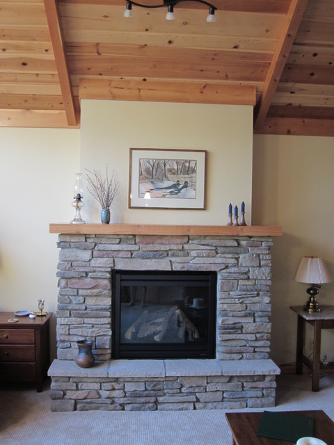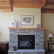 Gas fireplace with stone surround including a hearth area and mantle. All the wood on the fireplace & ceiling were from the old cabin that was torn down & refinished.