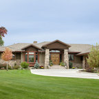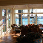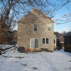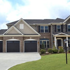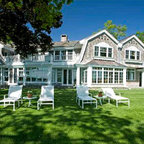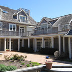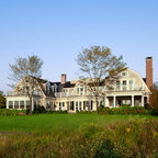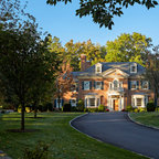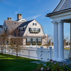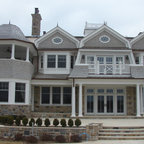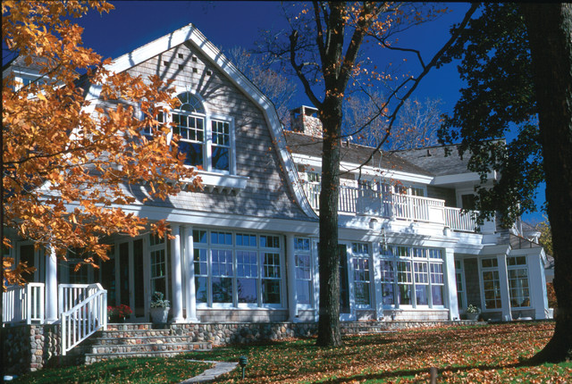 Foto della facciata di una casa grande grigia classica a due piani con rivestimento in legno e tetto a mansarda — Houzz