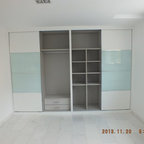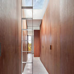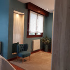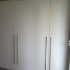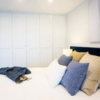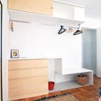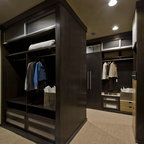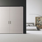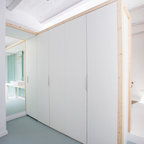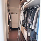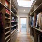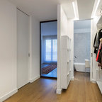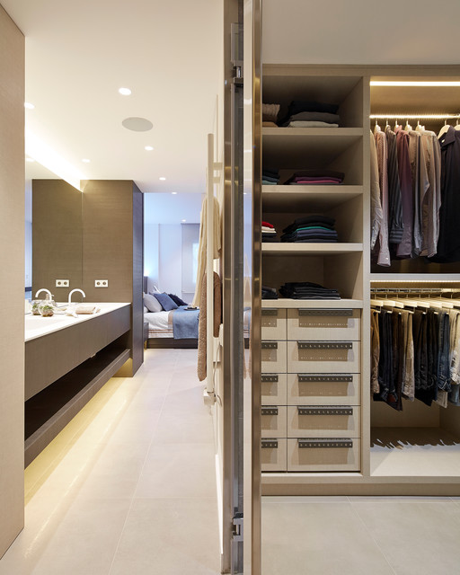 Esempio di uno spazio per vestirsi per uomo minimal di medie dimensioni con ante lisce, pavimento con piastrelle in ceramica e ante beige — Houzz