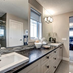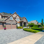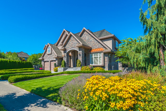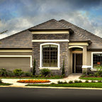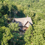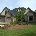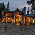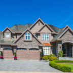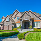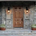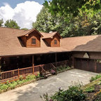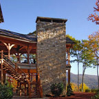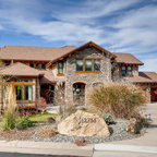 Immagine della facciata di una casa marrone rustica a due piani con rivestimento in pietra — Houzz