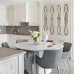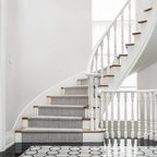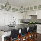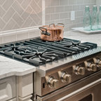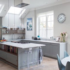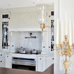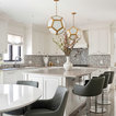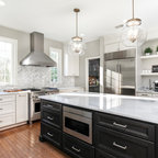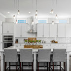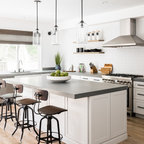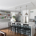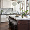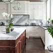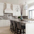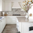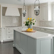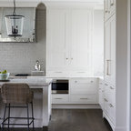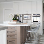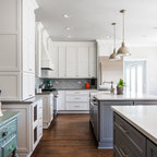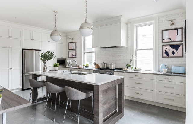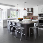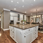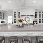 Esempio di una grande cucina classica con lavello a doppia vasca, ante con riquadro incassato, ante bianche, paraspruzzi bianco, elettrodomestici in acciaio inossidabile, isola, pavimento grigio, top bianco, top in quarzite, paraspruzzi con piastrelle in ceramica e pavimento con piastrelle in ceramica — Houzz