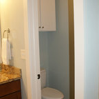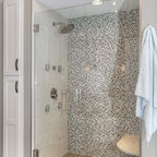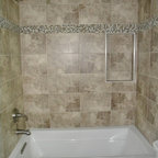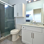 Idee per una stanza da bagno classica con ante lisce, ante in legno bruno, top in vetro, doccia alcova, piastrelle bianche, piastrelle diamantate e pareti blu — Houzz