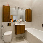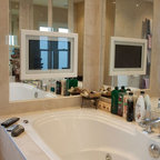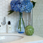 Idee per una stanza da bagno tradizionale con vasca ad alcova, vasca/doccia, piastrelle blu e piastrelle diamantate — Houzz