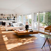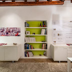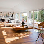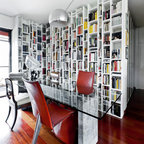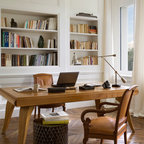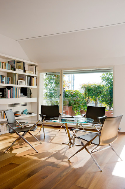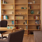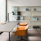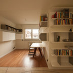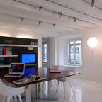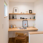 Ispirazione per un grande ufficio minimalista con pareti bianche, pavimento in legno massello medio e scrivania autoportante — Houzz