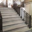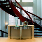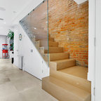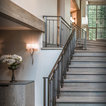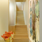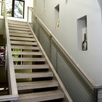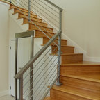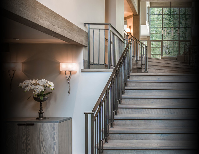 This contemporary staircase brings a striking sophistication to this custom home. Contemporary designs tend to cut out the clutter and embrace sleek simplicity without actually being minimalist. Absolute care was taken in this design to even the smallest details making it anything but minimalist. The European White oak treads have been both circle sawn and band sawn to create a beautiful texture and then given a white washed finish. The steel guard rail was completely custom designed and includes a mill finish, which consists of wire brushing all of the steel to make it smooth and shiny and then sealing it with bees wax. This highlights the various tones in the steel and creates a more naturally finished appearance. In addition, the escutcheons were all individually laser cut and included in the design to visually enhance the point at which the balusters were inserted into the treads. Each element worked together seamlessly to create a magnificent and flawless design.