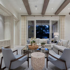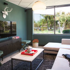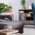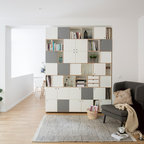 Ispirazione per un piccolo soggiorno scandinavo stile loft con pareti bianche, pavimento in laminato, nessun camino, nessuna TV e pavimento marrone — Houzz