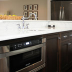 The simple lines of Denali and Hilton come together for a sensible approach to modern style; designed to complement today's busy lifestyle. Denali's textured surface offers rich dimensional flair, while Hilton adds a touch of glimmer with a reflective gloss surface. Both finishes come together on the island as a design focal point offering seating, a second sink and generous storage.