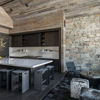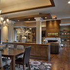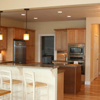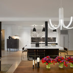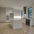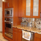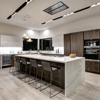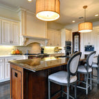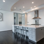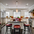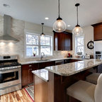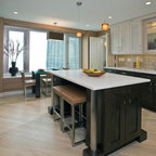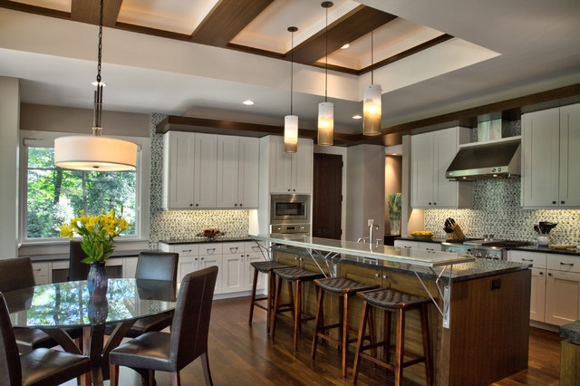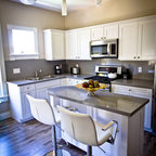 Esempio di una cucina ad U contemporanea con ante in stile shaker, ante bianche, top in granito, paraspruzzi multicolore, elettrodomestici in acciaio inossidabile, pavimento in legno massello medio, isola, pavimento marrone e top nero — Houzz