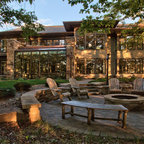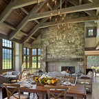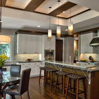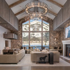 Like: ceiling detail, fireplace, smooth wood and windows. Changes: Add window seating, cabinet instead of open shelves. Center / equalize cabinetry more.