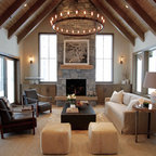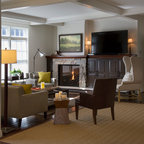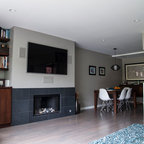 Like the more modern rectangular fireplace, wood surround, ceiling is interesting too.