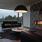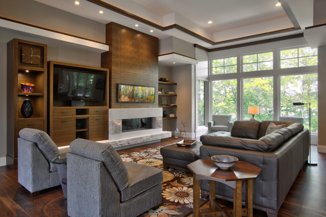 Esempio di un grande soggiorno minimalista aperto con sala formale, pareti bianche, pavimento in legno massello medio, camino lineare Ribbon, cornice del camino in pietra, TV a parete e pavimento marrone — Houzz