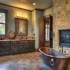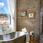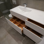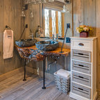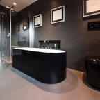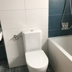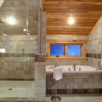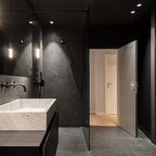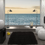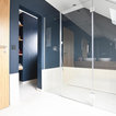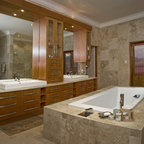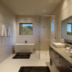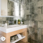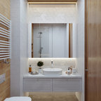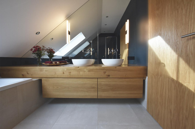 Ispirazione per una stanza da bagno con doccia moderna di medie dimensioni con ante lisce, ante in legno scuro, vasca da incasso, doccia a filo pavimento, WC sospeso, piastrelle beige, piastrelle in ceramica, pareti blu, pavimento con piastrelle in ceramica, lavabo a bacinella, top in legno, pavimento beige, porta doccia a battente, top marrone, toilette, due lavabi, mobile bagno sospeso, soffitto in carta da parati e carta da parati — Houzz