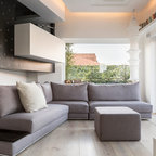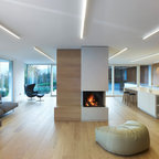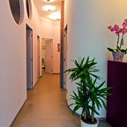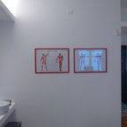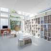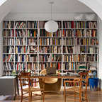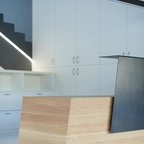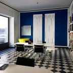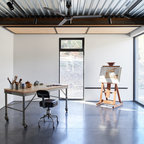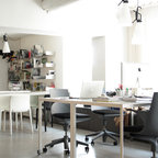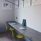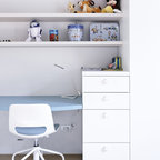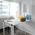 Idee per uno studio minimal con pareti bianche, scrivania autoportante e pavimento bianco — Houzz