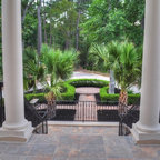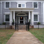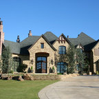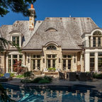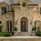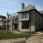Esempio della facciata di una casa grande grigia classica a due piani con rivestimento in pietra e tetto a capanna — Houzz