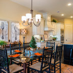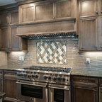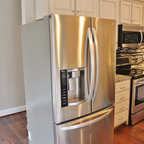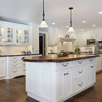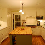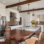 Esempio di un'ampia cucina chic con lavello stile country, ante con bugna sagomata, ante bianche, top in granito, paraspruzzi bianco, paraspruzzi in gres porcellanato, elettrodomestici da incasso, pavimento in legno massello medio e isola — Houzz