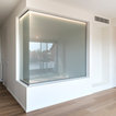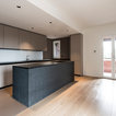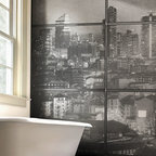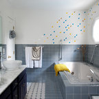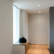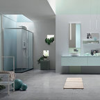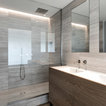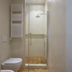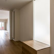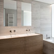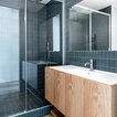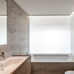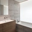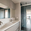Bagno ospiti: rivestimento con piastrelle di Appiani, mobile lavabo in rovere e piano + lavabo in corian bianco; rubinetteria Quadro Design