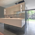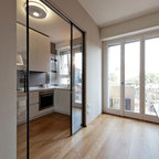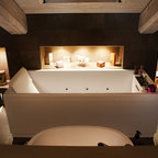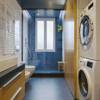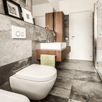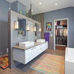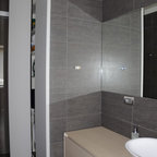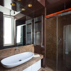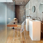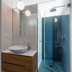 Esempio di una stanza da bagno moderna con ante a filo, ante in legno scuro, pavimento in legno massello medio e top bianco — Houzz