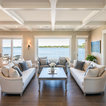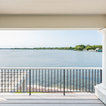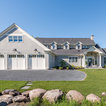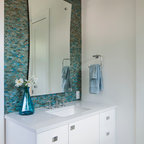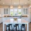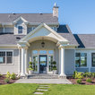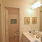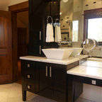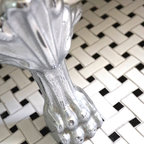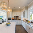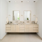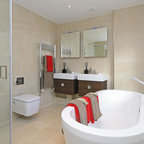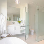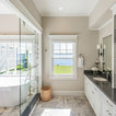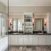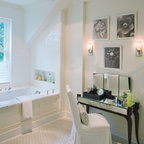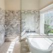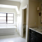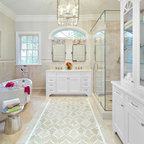 Foto di una grande stanza da bagno padronale chic con ante lisce, ante bianche, vasca freestanding, doccia aperta, piastrelle multicolore, piastrelle in pietra, lavabo sottopiano, pareti beige, pavimento in gres porcellanato, top in superficie solida e top grigio — Houzz