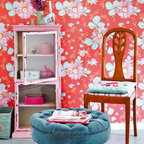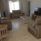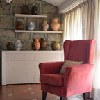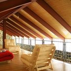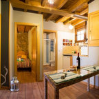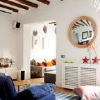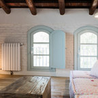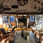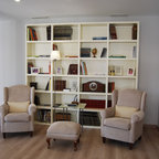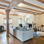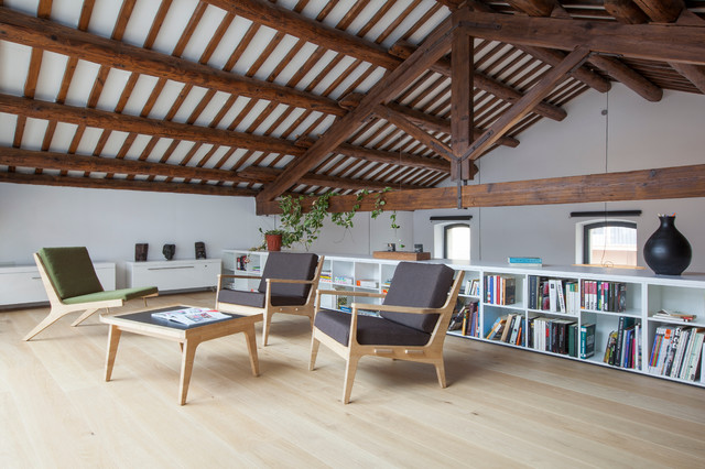 Ispirazione per un grande soggiorno country stile loft con libreria, pareti bianche, parquet chiaro, nessun camino e nessuna TV — Houzz
