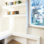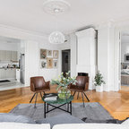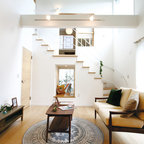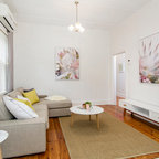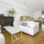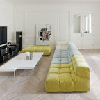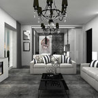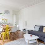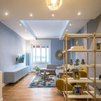 Immagine di un piccolo soggiorno design aperto con pareti grigie, parquet chiaro, TV a parete e pavimento beige — Houzz