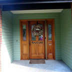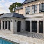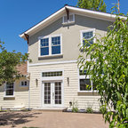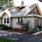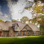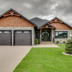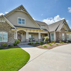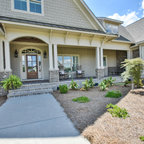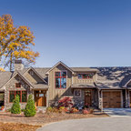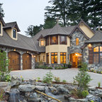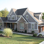 Ispirazione per la facciata di una casa unifamiliare grande beige american style a due piani con rivestimenti misti, tetto a capanna e copertura a scandole — Houzz
