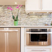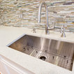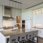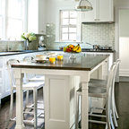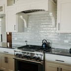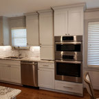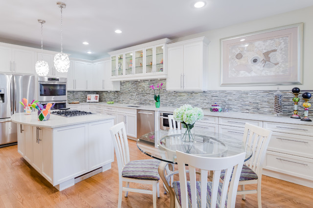 Immagine di una cucina classica con ante con riquadro incassato, ante bianche, paraspruzzi grigio, paraspruzzi con piastrelle a listelli, elettrodomestici in acciaio inossidabile e pavimento in legno massello medio — Houzz