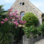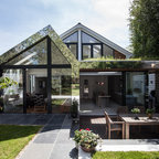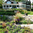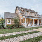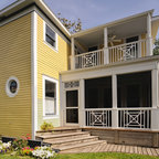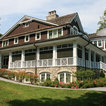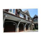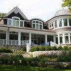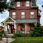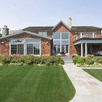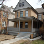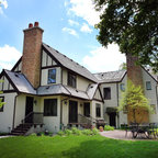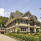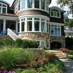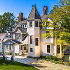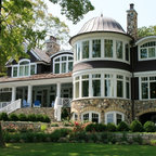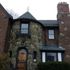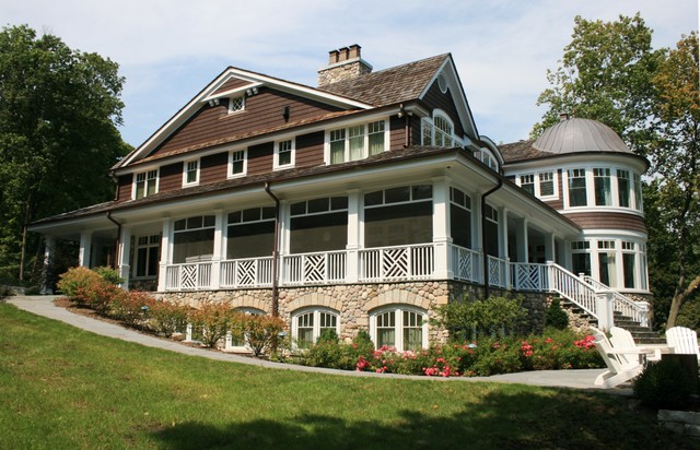 Foto della facciata di una casa grande marrone vittoriana a due piani con rivestimento in pietra, tetto a capanna e copertura mista — Houzz