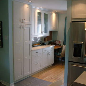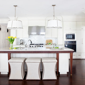 Ispirazione per una cucina design con lavello sottopiano, ante lisce, ante bianche, paraspruzzi a effetto metallico, paraspruzzi a specchio, elettrodomestici da incasso, pavimento in legno verniciato, pavimento nero e top bianco