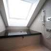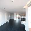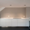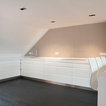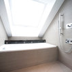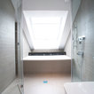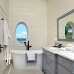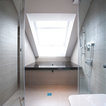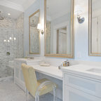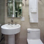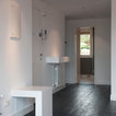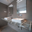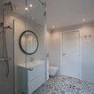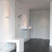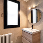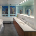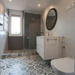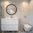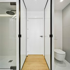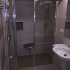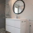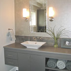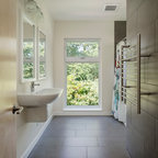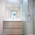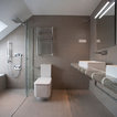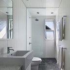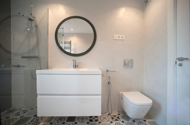 Ispirazione per una stanza da bagno con doccia moderna di medie dimensioni con ante lisce, ante bianche, doccia ad angolo, WC sospeso, pareti grigie, pavimento con piastrelle in ceramica e lavabo integrato — Houzz