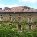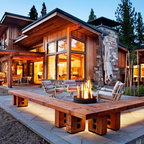 Esempio della facciata di una casa grande marrone rustica a piani sfalsati con rivestimento in pietra e tetto a una falda — Houzz
